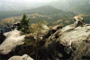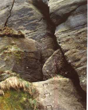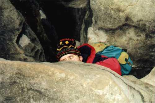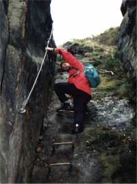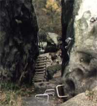 Wenn man ihn endlich gefunden hat, ist das erste mal 'Klettern' angesagt. Grade der erste Felsen hat zumindest mich ein wenig Überwindung gekostet. Wieder spannend wirds im Kamin (einer schönen Felshöhle), da hier ein paar der eisernen Steighilfen abgesägt sind. Am besten, man klemmt sich dort mit dem Rücken zur Wand und den Füßen nach vorn hinein und arbeitet sich langsam nach oben, bis man die nächste Steighilfe erreichen kann. Wenn man aus dem Schacht herauskommt und man damit das erste Ausrufezeichen überwunden hat, gehts dann mit nur noch wenig 'Aufwand' weiter, bis man schliesslich zum Reitsteig kommt. An dieser Stelle möchte ich noch eine kurze Anekdote berichten: Als ein paar Kumpels und meine Wenigkeit zum ersten mal die Rübezahlstiege besucht haben, kamen wir von oben. Als wir an der Stelle ankamen, an dem der Kamin von unten kommt, dachten wir erstmal 'Huch, wie gehts jetzt weiter?', da der Fels auf einmal steil nach unten abfällt (wäre also nur was für echte Kletterer). Zum Glück hörten wir plötzlich aus einem Loch am Boden von unten Stimmen und wussten 'Aha... durchs Loch'. ;)
