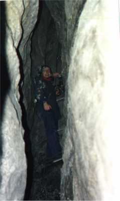 Ein schmaler Spalt führt uns ins felsige Dunkel. Weit führt uns dieser Gang jedoch nicht... zumindest nicht waagerecht! Es geht mal wieder die Wand nach oben. Auch hier sanierte Steighilfen aus stabilem Metall, ich kenne diesen Teil der Häntzschelstiege auch noch mit Holzleitern. Im Kamin gibts dann einen Absatz, wo man durch einen weiteren Spalt einen Blick nach draussen in die Natur werfen kann. Weiter gehts aber im Kamin senkrecht nach oben. Puh, waren die Steighilfen früher nicht mal näher beieinander?