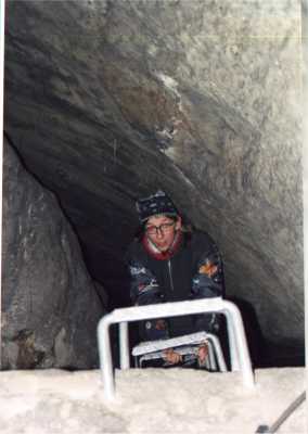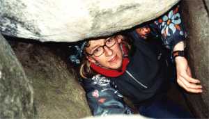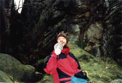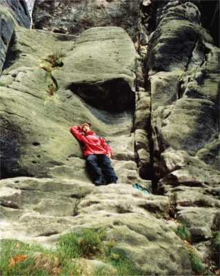 Nachdem die erste Häntzschel-Kletterei geschafft ist gibt es kurzfristig bei mir zittrige Beine: Um ein besonders 'wagemutiges' Foto nach unten zu schiessen, besteigt hier mein Fotograf und Bruder eine wackelige Felskugel und rutscht dabei soweit wie möglich an den 'Abgrund'. Das Foto ist zwar ganz nett geworden, wird aber niemals meinen 'Schrecken' gutmachen, den ich beim Anblick meines Bruders durchlebte.