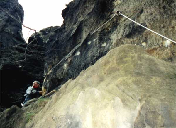 Erstmal geht es noch ein paar Meter weiter, bis wir endlich am eigentlichen Einstieg angelangt sind. Neues Metall blinkert und blitz uns entgegen, da die Häntzschelstiegensteighilfen frisch saniert sind. Als erstes geht es senkrecht den Felsen hoch. Die nächste Passage kostet Überwindung: Aussen am Felsen entlang, unten nur wenige Zentimeter zum stehen und gehen, oben nur ein wackeliges (aber natürlich sicheres, weil Stahl-) Seil!