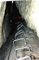 Ein schmaler Spalt führt uns ins felsige Dunkel. Weit führt uns dieser Gang jedoch nicht... zumindest nicht waagerecht! Es geht mal wieder die Wand nach oben. Auch hier sanierte Steighilfen aus stabilem Metall, ich kenne diesen Teil der Häntzschelstiege auch noch mit Holzleitern. Im Kamin gibts dann einen Absatz, wo man durch einen weiteren Spalt einen Blick nach draussen in die Natur werfen kann. Weiter gehts aber im Kamin senkrecht nach oben. Puh, waren die Steighilfen früher nicht mal näher beieinander?
