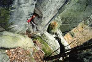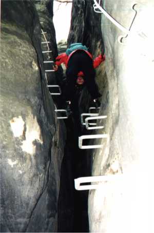 Wenn man ihn endlich gefunden hat, ist das erste mal 'Klettern' angesagt. Grade der erste Felsen hat zumindest mich ein wenig Überwindung gekostet. Wieder spannend wirds im Kamin (einer schönen Felshöhle), da hier ein paar der eisernen Steighilfen abgesägt sind. Am besten, man klemmt sich dort mit dem Rücken zur Wand und den Füßen nach vorn hinein und arbeitet sich langsam nach oben, bis man die nächste Steighilfe erreichen kann. Wenn man aus dem Schacht herauskommt und man damit das erste Ausrufezeichen überwunden hat, gehts dann mit nur noch wenig 'Aufwand' weiter, bis man schliesslich zum Reitsteig kommt. An dieser Stelle möchte ich noch eine kurze Anekdote berichten: Als ein paar Kumpels und meine Wenigkeit zum ersten mal die Rübezahlstiege besucht haben, kamen wir von oben. Als wir an der Stelle ankamen, an dem der Kamin von unten kommt, dachten wir erstmal 'Huch, wie gehts jetzt weiter?', da der Fels auf einmal steil nach unten abfällt (wäre also nur was für echte Kletterer). Zum Glück hörten wir plötzlich aus einem Loch am Boden von unten Stimmen und wussten 'Aha... durchs Loch'. ;)