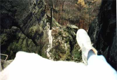 Nachdem die erste Häntzschel-Kletterei geschafft ist gibt es kurzfristig bei mir zittrige Beine: Um ein besonders 'wagemutiges' Foto nach unten zu schiessen, besteigt hier mein Fotograf und Bruder eine wackelige Felskugel und rutscht dabei soweit wie möglich an den 'Abgrund'. Das Foto ist zwar ganz nett geworden, wird aber niemals meinen 'Schrecken' gutmachen, den ich beim Anblick meines Bruders durchlebte.